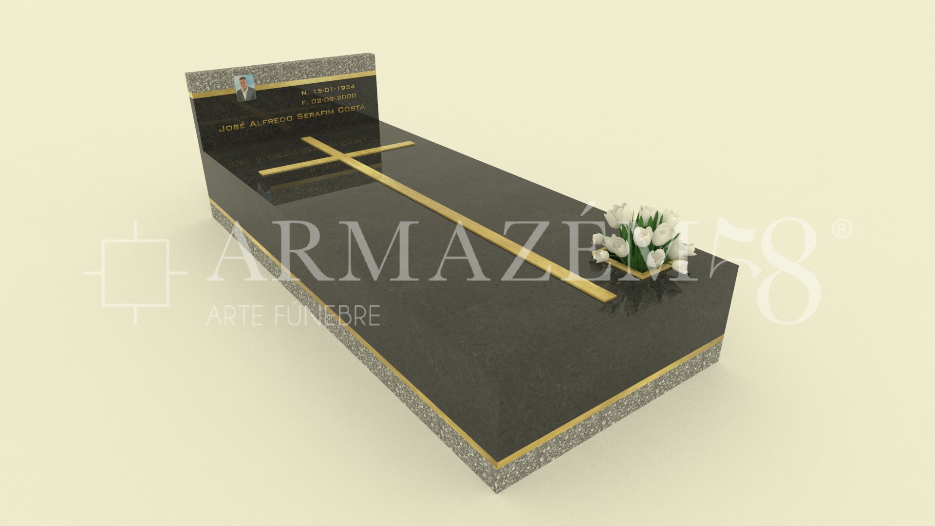 #CPR0011* CAMPA INDIVIDUAL Especificações:Granito, Acessórios e perfil de acabamento em latão, Floreira embutida, Personalização com mensagem gravada Disponível em diversas cores e materiais+ informações: 244 028 029 / 919 022 583 / 919 022 830